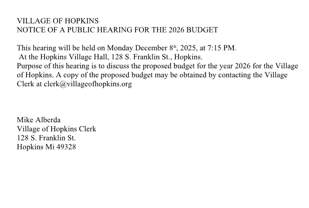 Our regular Village Council meetings at on the second Monday of each month, at 7:30 PM at the Village Hall (128 Franklin St, Hopkins, MI 49328). The Public is ALWAYS welcome at our meetings!